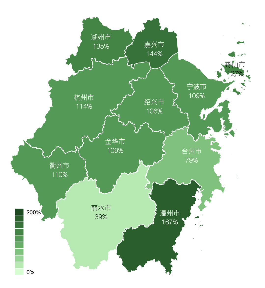 浙江省12個地級市分別以“全市”“全市城鎮(zhèn)”“市區(qū)”統(tǒng)計生活垃圾清運量、處理量,據(jù)此計算“焚燒清運比”可以發(fā)現(xiàn),浙江省內(nèi)生活垃圾“焚燒清運比”存在區(qū)域內(nèi)不均的情況。其中溫州市、嘉興市“焚燒清運比”分別高達167%、144%。詳見圖8。