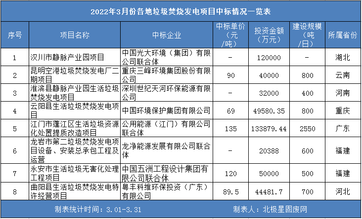 陽春三月已過,3月垃圾焚燒發(fā)電項(xiàng)目的開標(biāo)目數(shù)量與1、2月開標(biāo)數(shù)量總和持平,累計(jì)開標(biāo)8個(gè)項(xiàng)目,基于公開的項(xiàng)目信息,8個(gè)項(xiàng)目涉及總投資約49億人民幣,垃圾處理費(fèi)平均單價(jià)為100元/噸,預(yù)計(jì)新增垃圾焚燒處理產(chǎn)能超6350噸/日。同時(shí),3月開標(biāo)的8個(gè)項(xiàng)目個(gè)個(gè)看點(diǎn)十足。