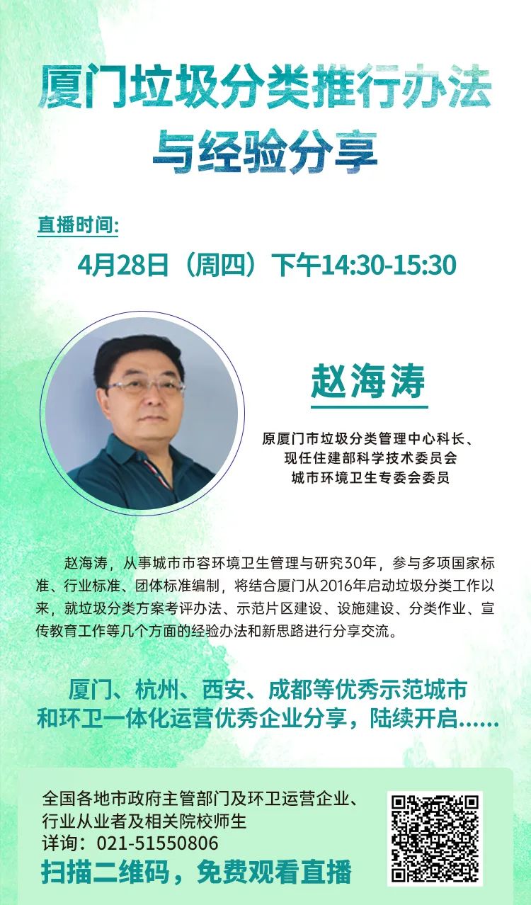 ■就 “廈門垃圾分類推行辦法與經(jīng)驗分享”為主題做線上直播,直播時間為4月28日(周四)下午14:30-15:30,歡迎大家踴躍報名,掃碼免費觀看直播。