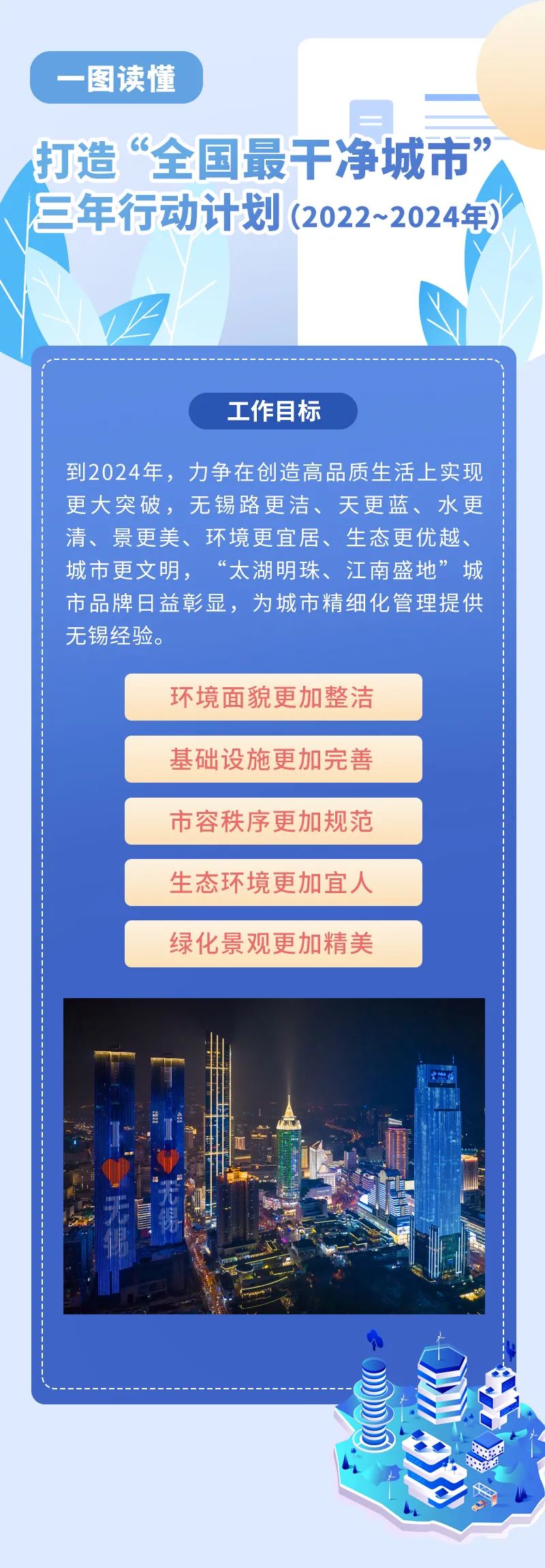 無(wú)錫市近日下發(fā)《打造“全國(guó)最干凈城市”三年行動(dòng)計(jì)劃(2022-2024年)》。去年底,無(wú)錫市政府印發(fā)《關(guān)于推進(jìn)無(wú)錫市區(qū)環(huán)衛(wèi)一體化作業(yè)改革的實(shí)施意見(jiàn)》。 在城市里旅游,除了特色景點(diǎn)、公共設(shè)施外,城市的干凈程度對(duì)游客而言是非常重要的印象分。而對(duì)于居住在這座城市的市民來(lái)說(shuō),清新的空氣、整潔的街道、蔥郁的綠化、清澈的水體,就算每天只在街巷里活動(dòng),也能覺(jué)得心曠神怡。當(dāng)前,城市發(fā)展中宜居、綠色、韌性、智慧、人文等需求更加凸顯,城市綜合實(shí)力和核心競(jìng)爭(zhēng)力的比拼,越來(lái)越外在體現(xiàn)為城市環(huán)境的比拼、城市品質(zhì)的比拼?!拔嗤P凰棲,花香蝶自來(lái)”。打造“全國(guó)最干凈城市”就是在提升營(yíng)商環(huán)境,就是在優(yōu)化創(chuàng)新創(chuàng)業(yè)環(huán)境。為此,無(wú)錫市發(fā)布了打造“全國(guó)最干凈城市”三年行動(dòng)計(jì)劃:到2024年,力爭(zhēng)在創(chuàng)造高品質(zhì)生活上實(shí)現(xiàn)更大突破,無(wú)錫路更潔、天更藍(lán)、水更清、景更美、環(huán)境更宜居、生態(tài)更優(yōu)越、城市更文明,“太湖明珠、江南盛地”城市品牌日益彰顯,為城市精細(xì)化管理提供無(wú)錫經(jīng)驗(yàn)。 說(shuō)到干凈城市,過(guò)去大家的印象無(wú)非是主次干道、街巷路面清潔,沒(méi)有違法建筑和違法戶(hù)外廣告,垃圾、污水無(wú)害化處理率高,城市綠化面積多等??偠灾?,只要城市的清掃保潔落實(shí)到位就行。如今,僅僅是環(huán)衛(wèi)意義上的干凈已不能滿(mǎn)足全市人民對(duì)美好生活的向往。