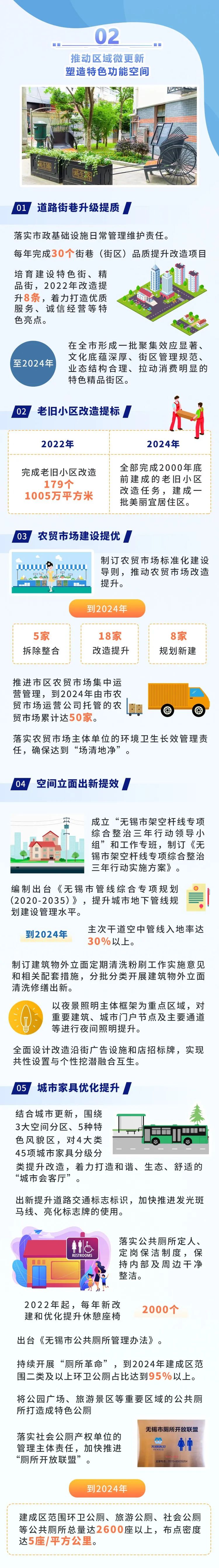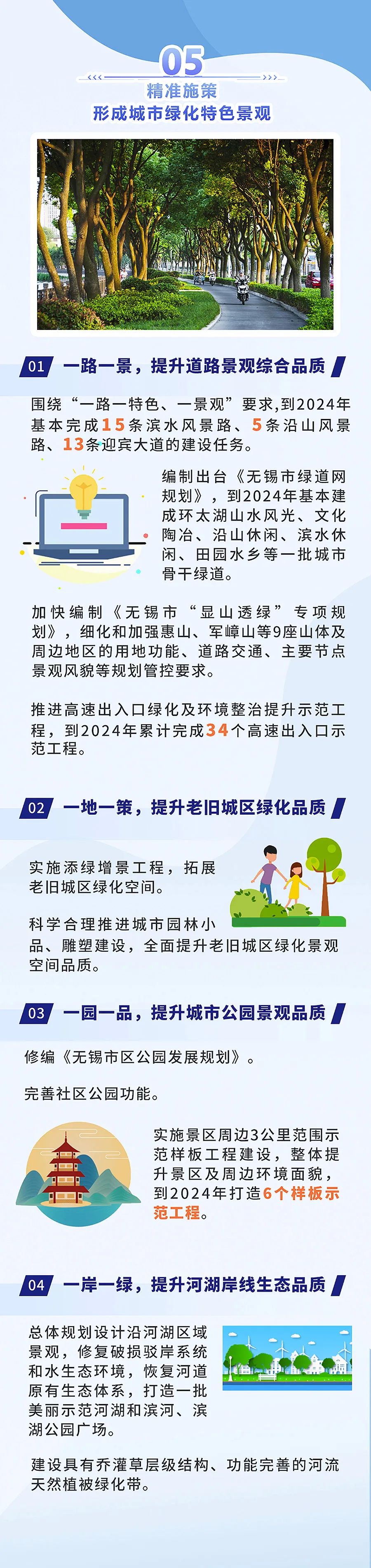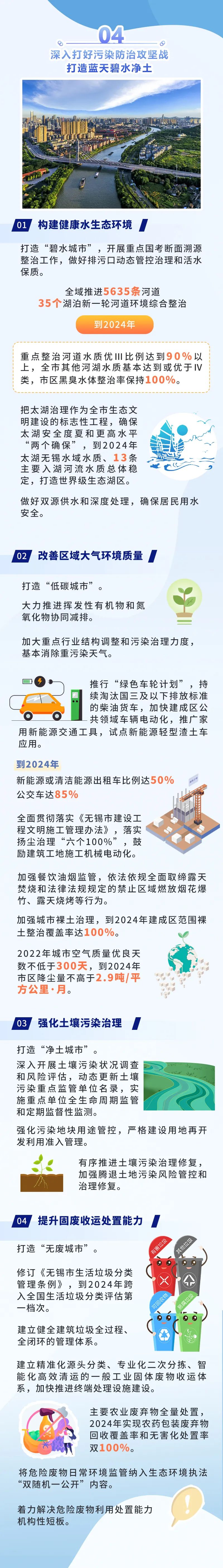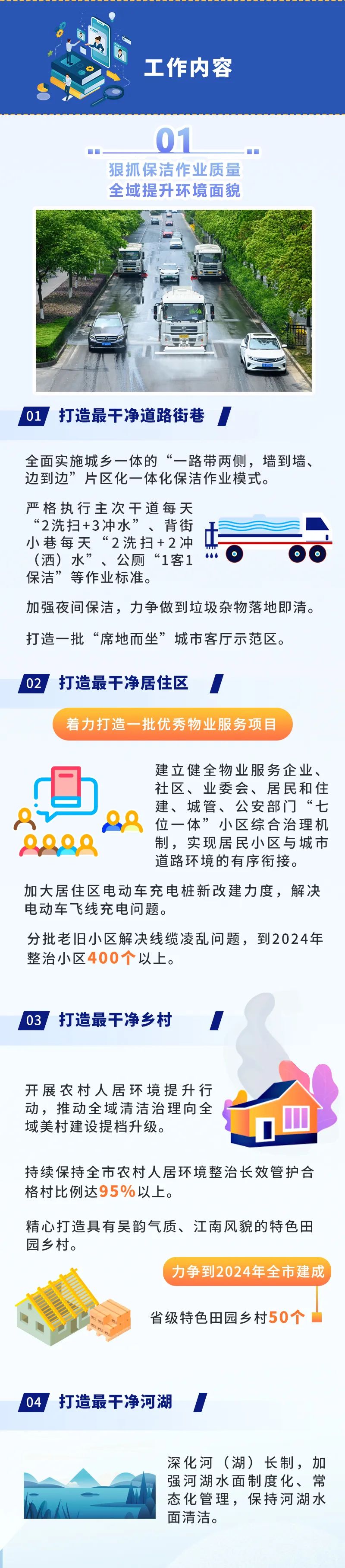 ●環(huán)境面貌更加整潔。到2024年,全市主次干道潔凈度100%、背街小巷潔凈度90%、河湖水面潔凈度100%、綠化區(qū)域潔凈度100%、小區(qū)環(huán)境潔凈度90%,打造“席地而坐”城市客廳示范區(qū)100個(gè)。●基礎(chǔ)設(shè)施更加完善。2000年底前建成的老舊小區(qū)改造率100%,完成街巷(街區(qū))品質(zhì)提升改造項(xiàng)目100個(gè),建成區(qū)一類(lèi)環(huán)衛(wèi)公廁比例25%;基礎(chǔ)設(shè)施管養(yǎng)到位,主要道路黑色化、標(biāo)線本色化95%,人行道板完好率95%,路燈設(shè)施亮燈率99%,戶(hù)外廣告設(shè)施整潔完好率95%,城市家具清潔完好率98%。●市容秩序更加規(guī)范。市區(qū)道路停車(chē)泊位管理覆蓋率100%,三亂小廣告治理覆蓋率100%,市容環(huán)衛(wèi)責(zé)任區(qū)履約率100%,顯見(jiàn)性市容違法行為“動(dòng)態(tài)清零”。●生態(tài)環(huán)境更加宜人。重污染天氣基本消除,空氣質(zhì)量?jī)?yōu)良天數(shù)比例達(dá)到82%以上,PM2.5年均濃度達(dá)到27微克/立方米;城市黑臭水體全面消除,地表水國(guó)省考斷面優(yōu)Ⅲ比例達(dá)到90%以上;土壤環(huán)境風(fēng)險(xiǎn)有效管控,重點(diǎn)建設(shè)用地安全利用率達(dá)到100%;固體廢棄物無(wú)害化處置率、資源化利用率達(dá)到和保持全國(guó)領(lǐng)先水平,城鄉(xiāng)生活垃圾分類(lèi)覆蓋率100%,保持生活垃圾無(wú)害化處理率100%,生活垃圾回收利用率36%,一般工業(yè)固廢綜合利用率98%。●綠化景觀更加精美。高品質(zhì)建設(shè)和改造提升城市綠化,形成有特色、有人文、生態(tài)化的景觀新風(fēng)格,建成區(qū)綠化覆蓋率達(dá)到43%,人均公園綠地面積達(dá)到14.9平方米,萬(wàn)人擁有綜合公園指數(shù)≥0.06,公園綠地10分鐘服務(wù)圈覆蓋率達(dá)到90%,建設(shè)城市骨干綠道100公里,建成國(guó)家生態(tài)園林城市。打造“全國(guó)最干凈城市”,不是空洞的口號(hào)、不是泛化的要求,而要體現(xiàn)在具體落實(shí)和實(shí)際效果上。打造可觀可感的“物之美”。全市每年完成30個(gè)街巷(街區(qū))品質(zhì)提升改造項(xiàng)目,培育建設(shè)特色街、精品街;到2024年,主次干道空中管線入地率達(dá)30%以上;全面設(shè)計(jì)改造沿街廣告設(shè)施和店招標(biāo)牌,實(shí)現(xiàn)共性設(shè)置與個(gè)性挖潛融合互生;對(duì)4大類(lèi)45項(xiàng)城市家具分級(jí)分類(lèi)提升改造,著力打造和諧、生態(tài)、舒適的“城市會(huì)客廳”,每年新改建和優(yōu)化提升休憩座椅2000個(gè),使生態(tài)業(yè)態(tài)、風(fēng)格風(fēng)貌、家具小品等城市要素與周邊環(huán)境、人文特色相得益彰,城市亮化、城市更新、基礎(chǔ)設(shè)施建設(shè)等方方面面精彩紛呈,讓人情不自禁“會(huì)心一笑”。打造無(wú)所不在的“凈之美”。路面平整衛(wèi)生、干凈清爽,街區(qū)秩序井然、席地可坐,公共空間長(zhǎng)治久潔,地下空間集約高效,垃圾分類(lèi)蔚然成風(fēng),城市中的細(xì)節(jié)與質(zhì)感詮釋著美好生活該有的模樣。城市干凈不干凈,“席地而坐”是一個(gè)標(biāo)準(zhǔn)。通過(guò)打造最干凈道路街巷、打造最干凈居住區(qū)、打造最干凈鄉(xiāng)村、打造最干凈河湖,建成“席地而坐”城市客廳示范區(qū)100個(gè),實(shí)現(xiàn)居民小區(qū)與城市道路環(huán)境的有序銜接,使省級(jí)特色田園鄉(xiāng)村達(dá)到50個(gè)。 打造詩(shī)意棲居的“景之美”。一路一景,提升道路景觀綜合品質(zhì);一地一策,提升老舊城區(qū)綠化品質(zhì);一園一品,提升城市公園景觀品質(zhì);一岸一綠,提升河湖岸線生態(tài)品質(zhì)。到2024年,全市基本完成15條濱水風(fēng)景路、5條沿山風(fēng)景路、13條迎賓大道的建設(shè)任務(wù);重點(diǎn)整治河道水質(zhì)優(yōu)Ⅲ比例達(dá)到90%以上,太湖無(wú)錫水域水質(zhì)、13條主要入湖河流水質(zhì)總體穩(wěn)定,打造世界級(jí)生態(tài)湖區(qū);還要進(jìn)入全國(guó)生活垃圾分類(lèi)評(píng)估第一檔次,打造“無(wú)廢城市”。屆時(shí),藍(lán)天綠地、銜山抱水的“大生態(tài)”格局基本形成,春能見(jiàn)花、夏能見(jiàn)綠、秋能見(jiàn)果、冬能見(jiàn)青的公園城市觸手可及,為生活、工作在其中的市民增添更多暖意、愜意、詩(shī)意。