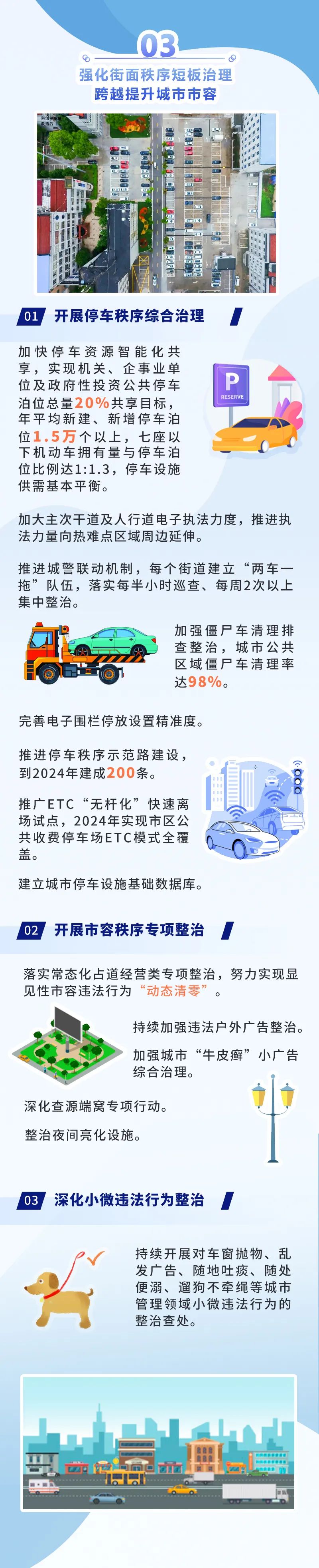 打造和諧文明的“治之美”。強(qiáng)化街面秩序短板治理,開(kāi)展停車(chē)秩序綜合治理、市容秩序?qū)m?xiàng)整治,深化小微違法行為整治,跨越提升城市市容。全市實(shí)現(xiàn)年平均新建、新增停車(chē)泊位1.5萬(wàn)個(gè)以上,七座以下機(jī)動(dòng)車(chē)擁有量與停車(chē)泊位比例達(dá)1∶1.3,停車(chē)設(shè)施供需基本平衡。實(shí)時(shí)感知、快速響應(yīng)、高效處置的數(shù)字化治理模式加快構(gòu)建,社會(huì)文明程度達(dá)到全國(guó)文明典范城市標(biāo)準(zhǔn),近悅遠(yuǎn)來(lái)、安居樂(lè)業(yè)、流連忘返、心向往之的“全國(guó)最干凈城市”成為無(wú)錫最閃亮的城市名片。 “全國(guó)最干凈城市”目標(biāo),不僅有外在干凈的形象也有內(nèi)在文明的氣質(zhì),不僅關(guān)系著城市發(fā)展也影響著城市美譽(yù)度,絕不是城管局一個(gè)部門(mén)的事,也不單單是城管范疇,是一個(gè)體現(xiàn)城市綜合實(shí)力的概念,是一個(gè)條塊聯(lián)動(dòng)、條線互動(dòng)的體系。