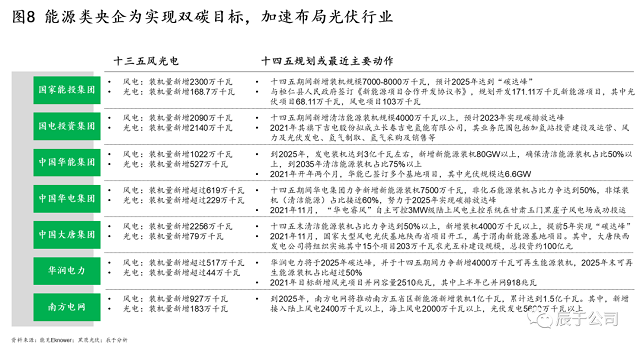 值得關(guān)注的是,為實(shí)現(xiàn)碳達(dá)峰碳中和,能源類央企加速布局光伏行業(yè),目標(biāo)宏大:例如國(guó)家能投集團(tuán)計(jì)劃“十四五”期間新增裝機(jī)規(guī)模7000-8000萬(wàn)千瓦,預(yù)計(jì)2025年實(shí)現(xiàn)碳達(dá)峰;國(guó)電投資集團(tuán)則計(jì)劃“十四五”期間新增清潔能源裝機(jī)規(guī)模4000萬(wàn)千瓦以上,預(yù)計(jì)2023年實(shí)現(xiàn)碳達(dá)峰(見圖8)。