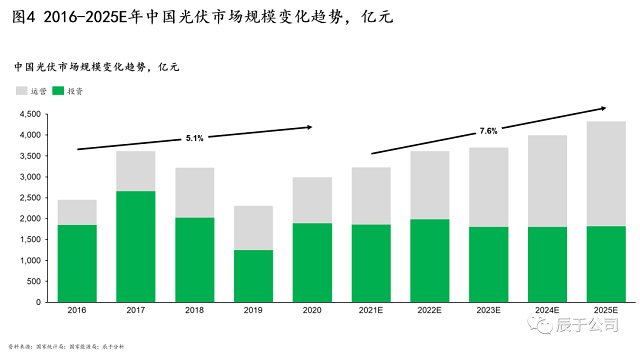 經(jīng)測(cè)算,辰于預(yù)計(jì)“十四五”期間我國(guó)光伏行業(yè)將保持7.6%的年復(fù)合增長(zhǎng),到2025年達(dá)到4300億元左右的市場(chǎng)規(guī)模,其中投資和運(yùn)營(yíng)分別為1800億元和2500億元左右,相比平穩(wěn)發(fā)展的光伏投資市場(chǎng),運(yùn)營(yíng)市場(chǎng)增速更快(見圖4)。