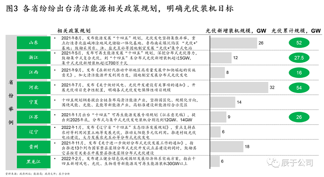 更加令人振奮的是,30·60雙碳風(fēng)口之下,我國(guó)光伏行業(yè)正迎來(lái)新的發(fā)展契機(jī),各省也在紛紛出臺(tái)光伏相關(guān)政策,明確光伏裝機(jī)目標(biāo),例如山東省在其能源發(fā)展“十四五”規(guī)劃中指出力爭(zhēng)到2025年末,光伏累計(jì)規(guī)模達(dá)到52GW,“十四五”期間省內(nèi)光伏新增裝機(jī)規(guī)模達(dá)26GW,相當(dāng)于翻了一番(見圖3)。