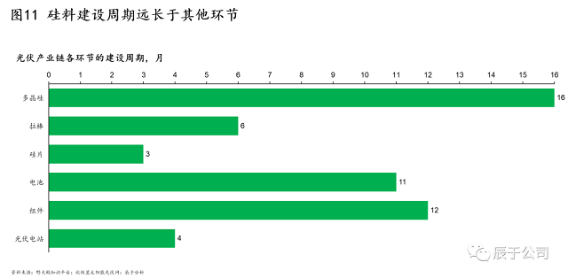 二是建設(shè)周期不同。硅料建設(shè)周期一般長(zhǎng)達(dá)16個(gè)月,組件、電池、拉棒、光伏電站、硅片則分別為12、11、6、4、3個(gè)月,由于建設(shè)周期差異較大,供需錯(cuò)配的問(wèn)題時(shí)有發(fā)生(見圖11)。