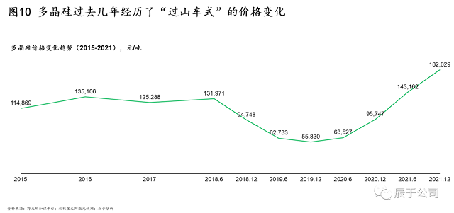 與此同時(shí),光伏產(chǎn)業(yè)鏈上各環(huán)節(jié)的價(jià)格波動(dòng)非常頻繁。以硅料為例, 2015-2018年6月,硅料價(jià)格基本維持在11-13萬(wàn)元/噸的水平,然而2018年7月以后,由于嚴(yán)重的供大于求(預(yù)計(jì)硅料供給過(guò)剩規(guī)模35GW以上),硅料價(jià)格出現(xiàn)大幅下降,直至2019年12月觸及谷底5.6萬(wàn)元/噸,之后隨之反彈,一路高歌猛進(jìn)到2021年底達(dá)到18萬(wàn)元/噸。這種過(guò)山車式的價(jià)格波動(dòng)也導(dǎo)致硅料企業(yè)的盈利水平忽高忽低(見圖10)。