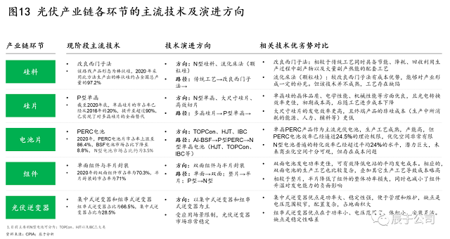 往前看,技術(shù)迭代仍在快速推進(jìn),例如硅片就剛剛經(jīng)歷過(guò)P型單晶硅片替代多晶硅片的過(guò)程,其市場(chǎng)占有率從2016年的20%,短短四年間就提升至2020年底的90%以上;隨之而來(lái)的是,大尺寸的N型單晶硅片的概念又被提出,由于發(fā)電效率更高、終端產(chǎn)品的非硅成本(生產(chǎn)中所消耗的能源、人力、輔料等)更低,想必又將帶來(lái)新一輪產(chǎn)品迭代風(fēng)潮(見圖13)。