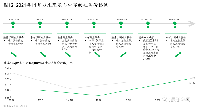三是競(jìng)爭(zhēng)壓力下的價(jià)格戰(zhàn)。2021年底以來(lái),兩大硅片龍頭先后下調(diào)價(jià)格:2021年11月30日,隆基股份宣布下調(diào)硅片報(bào)價(jià),最大降幅達(dá)9.75%,兩天后,中環(huán)股份也宣布降價(jià),最大降幅達(dá)12.48%,而后雙方持續(xù)降價(jià)“硝煙四起”,直到2022年初,價(jià)格戰(zhàn)才見平息,雙方開始逐步回調(diào)硅片報(bào)價(jià)(見圖12)。