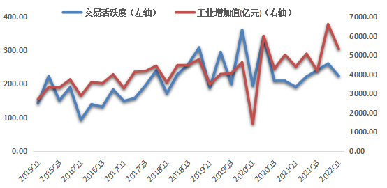 從工業(yè)經(jīng)濟(jì)指標(biāo)來看,浙江省排污權(quán)交易活躍度與工業(yè)增加值(采用浙江省規(guī)模以上工業(yè)增加值各季度增加值,非累計(jì)計(jì)算數(shù))整體也呈中度正相關(guān)走勢,顯著性水平小于0.01,皮爾遜相關(guān)系數(shù)為0.605。