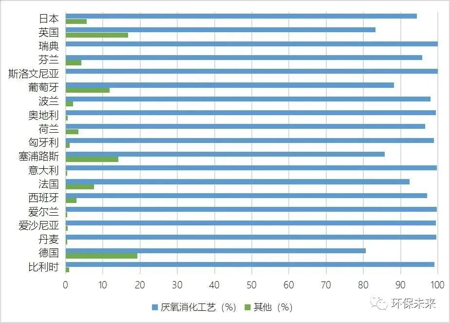 由圖1可以看出,目前發(fā)達(dá)國家的廚余垃圾處理技術(shù)主要以厭氧消化為主,約占市場份額的9成左右。其主要原因是相比于堆肥等其他處理技術(shù),厭氧消化技術(shù)更加環(huán)保和先進,受到業(yè)內(nèi)的廣泛關(guān)注,逐步形成一套成熟的產(chǎn)業(yè)鏈,進而得到市場的認(rèn)可和推廣。