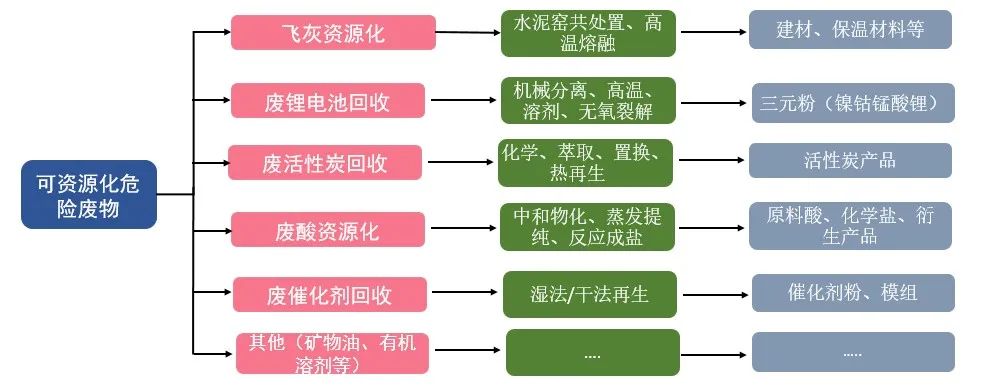 盡管無害化處置取得了長足的發(fā)展,但從長遠看仍然面臨填埋庫容占用、焚燒二次污染控制難、回收不徹底等問題。針對物性簡單、產(chǎn)生量大、有回收利用價值的危廢,應優(yōu)先考慮資源化利用。綜合分析市場需求及行業(yè)內(nèi)當前熱門資源化利用方向,當前聚焦較多的資源化利用技術(shù)主要包括焚燒灰渣利用、廢鋰電池回收、廢活性炭再生、廢酸資源化、廢催化劑再生、污泥貴金屬回收、廢有機溶劑回收等。