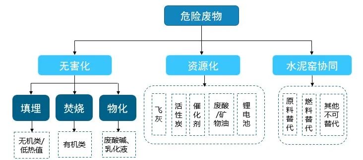 危險廢物的處理處置技術(shù)主要有資源化利用和無害化處置兩大類。無害化處置技術(shù)主要包括焚燒、物化和填埋三種方式,資源化利用技術(shù)則是將含有有效物質(zhì)等的高價值危廢,通過提純等方式將危廢加工成資源化產(chǎn)品進行出售。此外,水泥窯協(xié)同處置近幾年逐步發(fā)展壯大,也成為無害化和資源化利用的有效補充。從幾種技術(shù)的特點來看,資源化利用技術(shù)是優(yōu)先技術(shù),焚燒處置是適用性最廣的技術(shù),填埋處置則是最終處置方式。