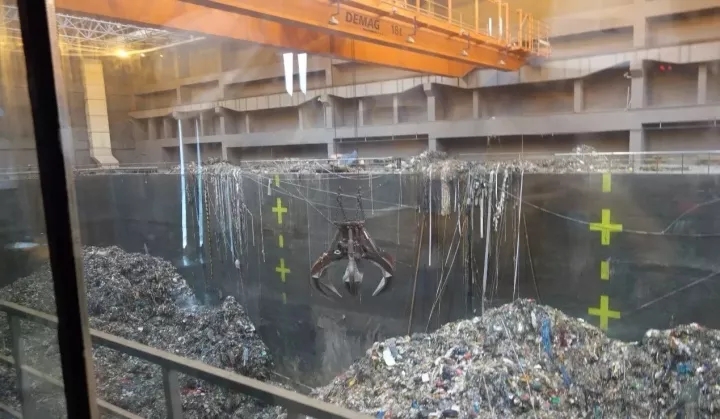 首先,生活垃圾運(yùn)輸車經(jīng)地磅稱重后,由上料坡道進(jìn)入卸料大廳。在垃圾吊控制室的統(tǒng)一指揮下,運(yùn)輸車將垃圾由指定卸料門卸入垃圾池內(nèi)。垃圾池采用全封閉性設(shè)計,氣壓為負(fù)33pa,有效防止了臭氣外逸。垃圾池上方有四臺垃圾吊抓斗(三用一備),每臺容積為12立方米,是目前國內(nèi)最大的單體抓斗,采用手動+半自動式操作將抓取的垃圾從池內(nèi)送入進(jìn)料口,進(jìn)入焚燒爐焚燒。