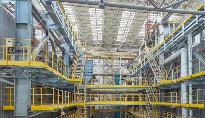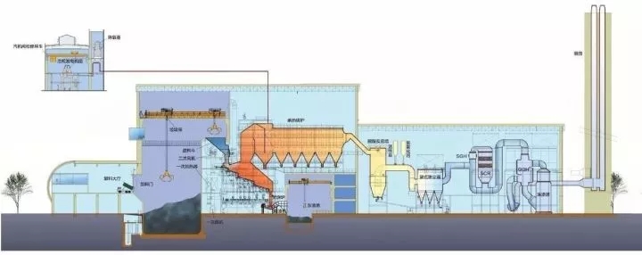 產(chǎn)生的高溫?zé)煔饨?jīng)過余熱鍋爐回收熱量,產(chǎn)生的蒸汽經(jīng)過汽輪機(jī)發(fā)電機(jī)組發(fā)電。煙氣凈化系統(tǒng)則是整個項目最大的亮點(diǎn),在國內(nèi)常用的“五步處理法”基礎(chǔ)之上加以改進(jìn),三步脫酸、兩步除塵、兩步脫硝,是國內(nèi)唯一一家采用如此復(fù)雜工藝流程的在運(yùn)行項目。