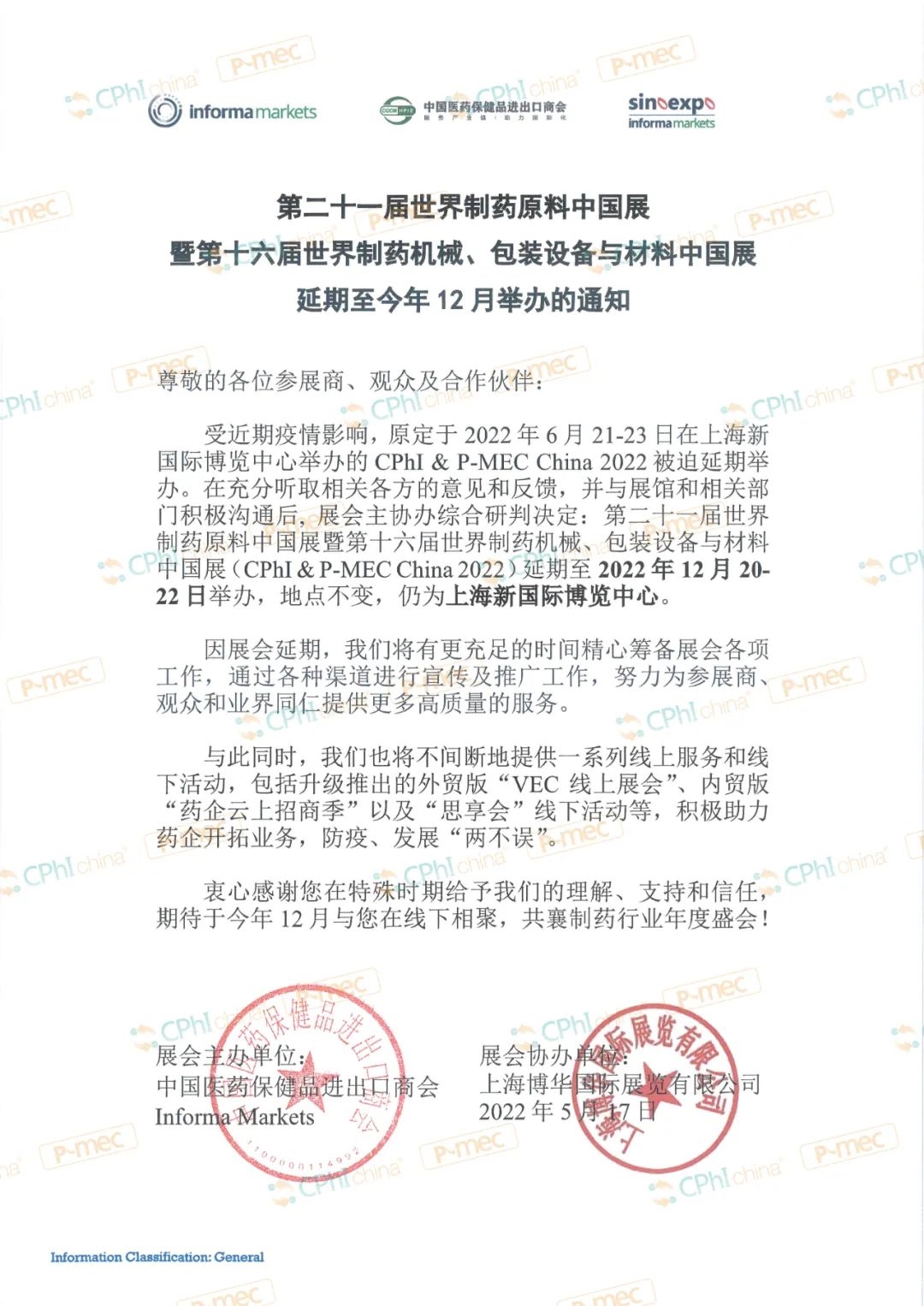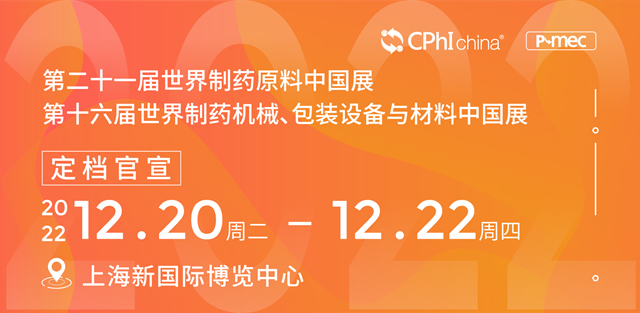 受近期疫情影響,原定于2022年6月21-23日在上海新國際博覽中心舉辦的CPhI & P-MEC China 2022被迫延期舉辦。在充分聽取相關各方的意見和反饋,并與展館和相關部門積極溝通后, 展會主協辦綜合研判決定:第二十一屆世界制藥原料中國展暨第十六屆世界制藥機械、包裝設備與材料中國展(CPhI & P-MEC China 2022)延期至2022年12月20-22日舉辦,地點不變,仍為上海新國際博覽中心。