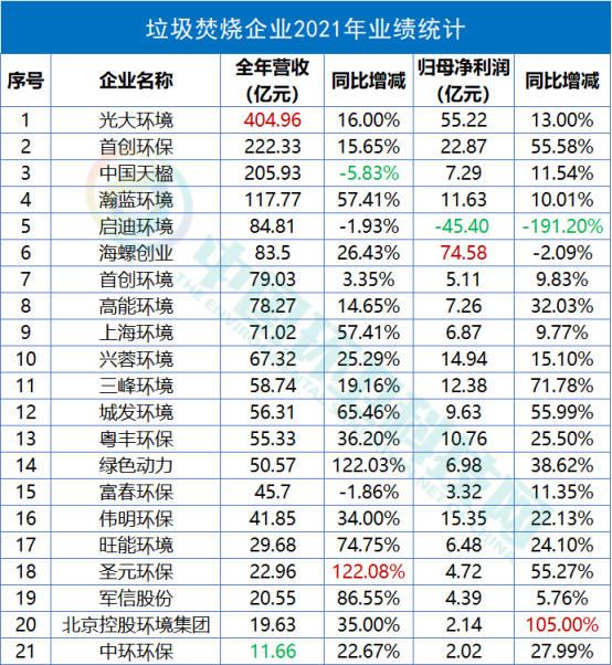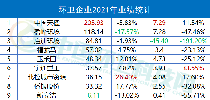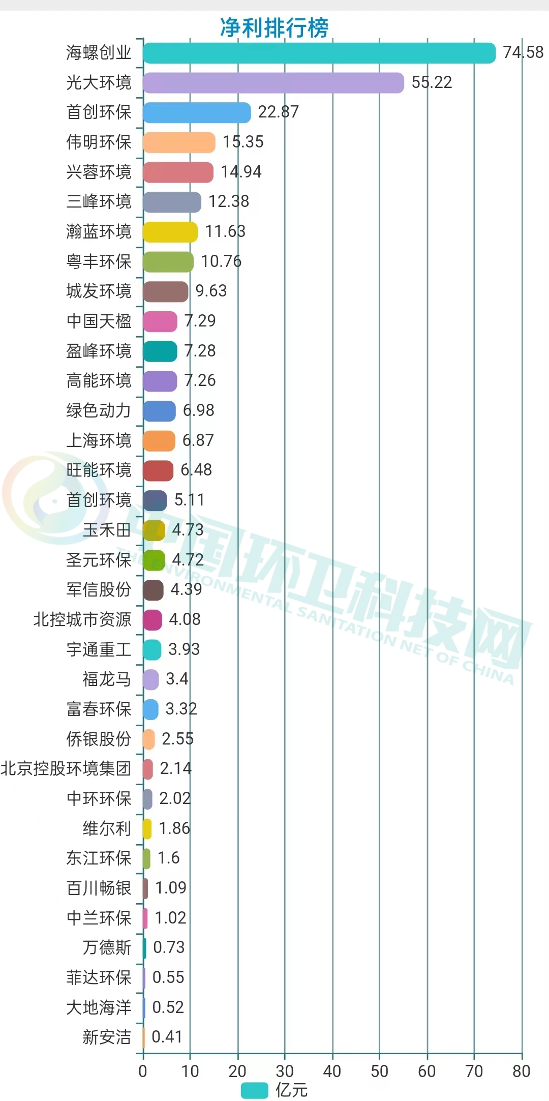 工程建設(shè)方面,建成投運項目91個,建成完工項目8個;新開工項目51個,完工并交付的環(huán)境修復(fù)服務(wù)6個、垃圾分類服務(wù)1個、EMC項目4個以及EPC項目9個。2021年,光大環(huán)境累計處理生活垃圾43,452,000噸,處理危廢及固廢269,000噸,提供綠色電力22,271,602,000千瓦時,可供18,559,000個家庭一年使用,相當(dāng)于節(jié)約標(biāo)煤8,909,000噸,減少二氧化碳排放20,211,000噸。同期處理污水1,698,710,000立方米,處理垃圾發(fā)電廠滲濾液9,635,000立方米,減少COD排放740,000噸。在凈利榜中,海螺創(chuàng)業(yè)以74.58億元的歸母凈利潤雄踞榜首。海螺創(chuàng)業(yè),2013年12月在香港聯(lián)合交易所主板上市(股票代碼:00586.HK),是一家提供節(jié)能環(huán)保“一攬子”解決方案的大型企業(yè)集團,產(chǎn)業(yè)涉及節(jié)能、環(huán)保、新型建材、港口物流四大類,業(yè)務(wù)涵蓋生活垃圾處理、固廢危廢處置、黑臭水體治理、新型建材、港口貿(mào)易、余熱發(fā)電、高效節(jié)能立磨等。細分業(yè)務(wù)板塊,2021年在垃圾處置領(lǐng)域,海螺創(chuàng)業(yè)營收57.44億元,同比增長19.38%,占全部營收比重為68.78%。▲ 海螺創(chuàng)業(yè)分業(yè)務(wù)收入年報披露,2021年,海螺創(chuàng)業(yè)垃圾發(fā)電業(yè)務(wù)板塊共接收生活垃圾約540萬噸,處置生活垃圾約456萬噸,上網(wǎng)電量約16.65億度,按照入爐量計算的平均噸上網(wǎng)電量約為365度,較去年同比提高19度。目前,海螺創(chuàng)業(yè)已成功取得貴州清鎮(zhèn)、重慶巫山、吉林洮南、河北圍場、越南春山等13個項目以及并購的10個項目,共計23個焚燒發(fā)電項目,涉及產(chǎn)能規(guī)模約567萬噸/年。3月30日,海螺創(chuàng)業(yè)分拆海螺環(huán)保成功在香港聯(lián)合交易所主板上市。日前,又宣布擬分拆海創(chuàng)綠能于上海證券交易所獨立上市。在大部分上市企業(yè)都實現(xiàn)盈利的背景下,博世科和啟迪環(huán)境成為唯二虧損的企業(yè),前者虧損5.15億,后者的虧損更是達到了驚人的45.4億。博世科,是一家位于廣西的環(huán)保企業(yè),2015年,在深交所創(chuàng)業(yè)板上市,業(yè)務(wù)領(lǐng)域重點為工業(yè)環(huán)境治理、城鄉(xiāng)環(huán)境、土壤環(huán)境修復(fù)、固廢處置與危廢處置、智慧環(huán)衛(wèi)、環(huán)境服務(wù)業(yè)等。對于虧損原因,博世科在年報中披露主要是受到疫情反復(fù)、經(jīng)濟下行、行業(yè)競爭加劇、市政項目結(jié)算和老舊項目回款不及預(yù)期等內(nèi)外部發(fā)展阻力綜合影響。啟迪環(huán)境,這個曾經(jīng)的固廢領(lǐng)域龍頭企業(yè),最近頻頻登上環(huán)衛(wèi)科技網(wǎng)的頭條,對于它已無須過多贅述??梢哉f,它的虧損早就在業(yè)內(nèi)人士的預(yù)料之中。而對于虧損原因,啟迪環(huán)境在年報中這樣解釋:“系公司對現(xiàn)有資產(chǎn)、項目進行全面梳理,部分項目擬戰(zhàn)略性退出,公司根據(jù)《企業(yè)會計準則》規(guī)定對相關(guān)資產(chǎn)計提減值所致。不過,該虧損對公司當(dāng)前經(jīng)營及償債能力未產(chǎn)生重大影響?!?/span>具體來說,原因包括對已停建項目、擬退出項目計提資產(chǎn)減值;對資產(chǎn)運營效率較低、不能持續(xù)運營和公司整體戰(zhàn)略涵蓋不到的項目進行退出、轉(zhuǎn)讓處置;對部分款項回收存在實質(zhì)性障礙的應(yīng)收賬款、其他應(yīng)收款、長期應(yīng)收款及應(yīng)收票據(jù)計提信用減值損失等。如今,博世科于2021年完成混改,廣環(huán)投成為其控股股東。啟迪環(huán)境與城發(fā)環(huán)境的合并雖然存在客觀上的“不確定性”,混改終究會完成。我們也希望完成混改后的兩家企業(yè),能夠迅速走上正軌,扭虧為盈。天楹、盈峰領(lǐng)跑,唯宇通、北控實現(xiàn)雙增這36家上市企業(yè)中有9家公司主營業(yè)務(wù)為環(huán)衛(wèi)板塊,中國天楹、盈峰環(huán)境和啟迪環(huán)境領(lǐng)跑營收榜,中國天楹、盈峰環(huán)境和玉禾田則在凈利榜上名列前茅。中國天楹,早在1994年就登陸深交所主板A股。其以垃圾焚燒發(fā)電、城市環(huán)境服務(wù)、環(huán)保裝備制造為壓艙石,打通了從前端清掃、中轉(zhuǎn)到分選、末端處置的城市環(huán)境服務(wù)全產(chǎn)業(yè)鏈。2021年,在城市環(huán)境服務(wù)板塊,其營業(yè)收入達到90.84億元,占全部營收比重44.11%。2021年,中國天楹中標(biāo)了烏海市濱河新區(qū)環(huán)衛(wèi)作業(yè)市場化運營項目,如皋長江鎮(zhèn)道路、河道保潔、垃圾清運及農(nóng)村環(huán)境整治服務(wù)外包項目,張北縣草原天路環(huán)境衛(wèi)生服務(wù)政府采購項目以及任丘市城鄉(xiāng)環(huán)衛(wèi)一體化農(nóng)村部分對外承包項目等多個城市環(huán)境服務(wù)項目,為境內(nèi)18個省市自治區(qū)35個城市提供了專業(yè)的城市環(huán)境服務(wù)。盈峰環(huán)境,于2000年在深交所主板A股上市。其主營業(yè)務(wù)包括環(huán)衛(wèi)服務(wù)和環(huán)衛(wèi)裝備,為客戶在城鄉(xiāng)保潔消毒、生活垃圾分類、固廢垃圾清掃運處、環(huán)衛(wèi)人員管理、餐廚垃圾收運、渣土運輸監(jiān)管、滲濾液處理、智慧城市建設(shè)等領(lǐng)域提供全新維度的全生命周期物聯(lián)網(wǎng)集成應(yīng)用解決方案和智慧平臺運營服務(wù);環(h