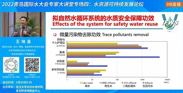 從微量污染物去除功效來看,PPCPs在景觀湖中能得到有效去除;從生物毒性控制功效上來看,景觀湖也有效控制了各類生物毒性,而水回用的水質(zhì)安全得到了有效保障。其自然作用機(jī)制,①是吸附作用,②是光解作用,③是水生生物凈化作用。王曉昌教授表示,構(gòu)建擬自然水循環(huán)系統(tǒng)是污水資源化利用未來的發(fā)展方向,其水質(zhì)安全保障功效已經(jīng)在實(shí)踐中得到了驗(yàn)證。