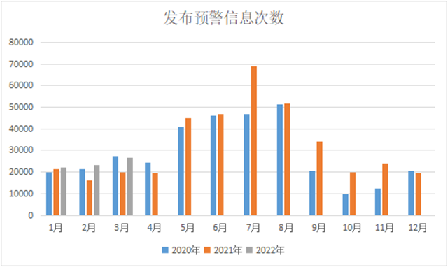 依照《國家突發(fā)事件預警信息發(fā)布情況月報》,綜合對比2020年1月——2022年3月數據信息可知,全國各部門通過國家預警發(fā)布系統(tǒng)發(fā)布預警信息高點主要集中在5月——8月,表明夏季污染率更高;研究表明夏季的陽光輻射致使臭氧常成為多地居高不下的首要污染物。