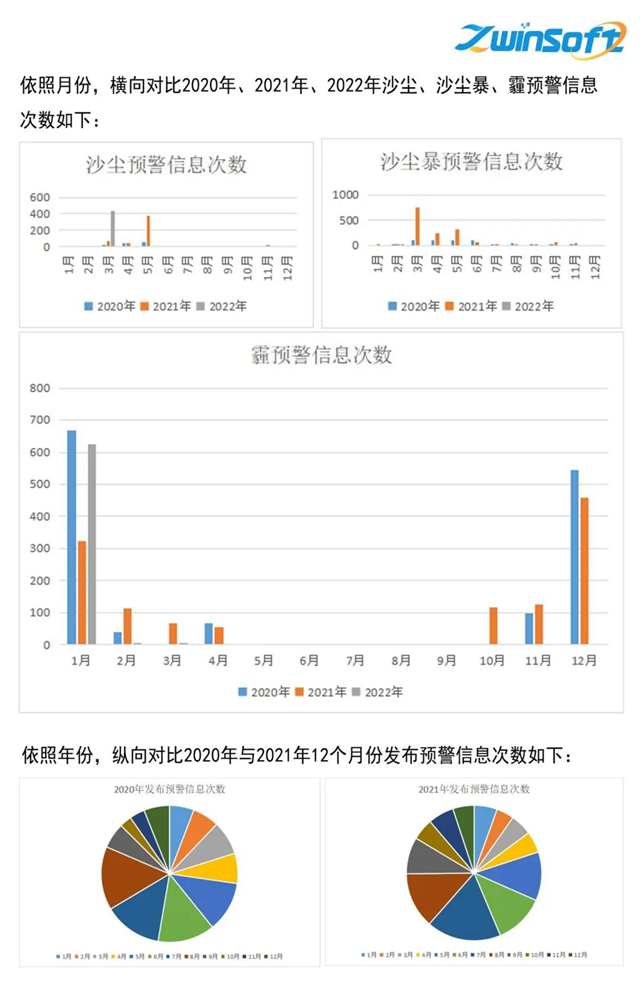 2021年,我國首次沙塵天氣過程發(fā)生時間為1月10日,較2000-2020年平均(2月17日)偏早38天,較2020年(2月13日)偏早34天,沙塵過程首發(fā)時間為2002年以來最早。不僅如此,通過《國家突發(fā)事件預警信息發(fā)布情況月報》2020年1月——2022年3月數據的比對分析,智易時代還發(fā)現了一些有趣的小規(guī)律。
