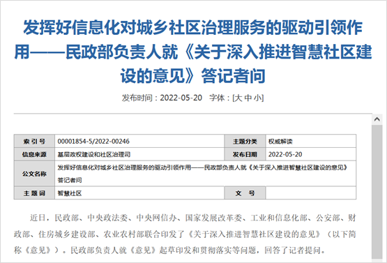 《意見》提出,加強(qiáng)智慧社區(qū)基礎(chǔ)設(shè)施建設(shè)改造。推進(jìn)小區(qū)智能感知設(shè)施建設(shè),擴(kuò)大智能感知設(shè)施和技術(shù)在生活垃圾處理等領(lǐng)域應(yīng)用。《關(guān)于深入推進(jìn)智慧社區(qū)建設(shè)的意見》全文如下:關(guān)于深入推進(jìn)智慧社區(qū)建設(shè)的意見智慧社區(qū)是充分應(yīng)用大數(shù)據(jù)、云計(jì)算、人工智能等信息技術(shù)手段,整合社區(qū)各類服務(wù)資源,打造基于信息化、智能化管理與服務(wù)的社區(qū)治理新形態(tài)。為充分運(yùn)用現(xiàn)代信息技術(shù),不斷提升城鄉(xiāng)社區(qū)治理服務(wù)智慧化、智能化水平,根據(jù)《中共中央 國務(wù)院關(guān)于加強(qiáng)基層治理體系和治理能力現(xiàn)代化建設(shè)的意見》、《國務(wù)院辦公廳關(guān)于印發(fā)〈“十四五”城鄉(xiāng)社區(qū)服務(wù)體系建設(shè)規(guī)劃〉的通知》等文件要求,現(xiàn)就推進(jìn)智慧社區(qū)建設(shè)提出如下意見:(一)指導(dǎo)思想。以習(xí)近平新時(shí)代中國特色社會(huì)主義思想為指導(dǎo),深入學(xué)習(xí)貫徹習(xí)近平總書記關(guān)于網(wǎng)絡(luò)強(qiáng)國的重要思想和基層治理的重要論述精神,貫徹落實(shí)黨的十九大和十九屆歷次全會(huì)精神,立足新發(fā)展階段,完整、準(zhǔn)確、全面貫徹新發(fā)展理念,服務(wù)加快構(gòu)建新發(fā)展格局,深化物聯(lián)網(wǎng)、大數(shù)據(jù)、云計(jì)算和人工智能等信息技術(shù)應(yīng)用,按照智慧城市和現(xiàn)代社區(qū)的發(fā)展要求,依托社區(qū)數(shù)字化平臺(tái)和線下社區(qū)服務(wù)機(jī)構(gòu),集約建設(shè)便民惠民智慧服務(wù)圈,提供線上線下相融合的社區(qū)生活服務(wù)、社區(qū)治理及公共服務(wù)、智能小區(qū)等服務(wù),讓社區(qū)更加和諧有序、服務(wù)更有溫度,不斷增強(qiáng)居民獲得感、幸福感、安全感。——堅(jiān)持黨的全面領(lǐng)導(dǎo)。把堅(jiān)持和加強(qiáng)黨的全面領(lǐng)導(dǎo)貫穿于智慧社區(qū)建設(shè)的全過程和各方面,確保智慧社區(qū)建設(shè)的正確方向。——堅(jiān)持以人民為中心。始終把滿足人民對(duì)美好生活的向往作為出發(fā)點(diǎn)和落腳點(diǎn),拓展應(yīng)用服務(wù)場景,讓數(shù)據(jù)多跑路、群眾少跑腿。——堅(jiān)持統(tǒng)籌規(guī)劃。強(qiáng)化系統(tǒng)觀念,整合現(xiàn)有資源,推動(dòng)系統(tǒng)集成、數(shù)據(jù)共享和業(yè)務(wù)協(xié)同,打破信息壁壘,為基層賦能減負(fù)。——堅(jiān)持需求導(dǎo)向。立足社區(qū)資源稟賦和居民需求,強(qiáng)化系統(tǒng)建設(shè)的實(shí)用性、前瞻性和可擴(kuò)展性,突出以城帶鄉(xiāng)、急用先行、梯次推進(jìn)、迭代更新。——堅(jiān)持安全發(fā)展。加強(qiáng)智慧社區(qū)網(wǎng)絡(luò)和數(shù)據(jù)安全管理,強(qiáng)化關(guān)鍵信息基礎(chǔ)設(shè)施防護(hù),依法保護(hù)居民信息安全和個(gè)人隱私。(三)建設(shè)目標(biāo)。到2025年,基本構(gòu)建起網(wǎng)格化管理、精細(xì)化服務(wù)、信息化支撐、開放共享的智慧社區(qū)服務(wù)平臺(tái),初步打造成智慧共享、和睦共治的新型數(shù)字社區(qū),社區(qū)治理和服務(wù)智能化水平顯著提高,更好感知社會(huì)態(tài)勢、暢通溝通渠道、輔助決策施政、方便群眾辦事。(一)集約建設(shè)智慧社區(qū)平臺(tái)。充分依托已有平臺(tái),因地制宜推進(jìn)智慧社區(qū)綜合信息平臺(tái)建設(shè),推動(dòng)部署在不同層級(jí)、不同部門的各類社區(qū)信息系統(tǒng)與智慧社區(qū)綜合信息平臺(tái)聯(lián)網(wǎng)對(duì)接或向其遷移集成。依法向社區(qū)下放政務(wù)服務(wù)審批受理權(quán)限,擴(kuò)大社區(qū)政務(wù)服務(wù)事項(xiàng)網(wǎng)上受理、辦理數(shù)量和種類,拓展政務(wù)事項(xiàng)查詢、辦理、反饋功能。完善電子政務(wù)服務(wù)流程,實(shí)行“前臺(tái)一口受理、后臺(tái)分工協(xié)同”運(yùn)行模式,推動(dòng)跨部門業(yè)務(wù)協(xié)同、信息實(shí)時(shí)共享。以設(shè)區(qū)的市為單位,大幅度優(yōu)化精簡部署在社區(qū)的業(yè)務(wù)應(yīng)用系統(tǒng),整合功能相對(duì)單一、相近或重復(fù)的辦公類、管理類、學(xué)習(xí)類等APP,整治“指尖上的形式主義”。推進(jìn)智慧社區(qū)綜合信息平臺(tái)與城市運(yùn)行管理服務(wù)平臺(tái)、智慧物業(yè)管理服務(wù)平臺(tái)、智能家庭終端互聯(lián)互通和融合應(yīng)用,提供一體化管理和服務(wù)。(二)拓展智慧社區(qū)治理場景。依托智慧社區(qū)綜合信息平臺(tái)建立健全民情反饋、風(fēng)險(xiǎn)研判、應(yīng)急響應(yīng)、輿情應(yīng)對(duì)機(jī)制,提升社區(qū)全周期管理水平。全面推進(jìn)“互聯(lián)網(wǎng)+社區(qū)黨建”,推動(dòng)社區(qū)黨建工作和黨員管理服務(wù)信息化,做好網(wǎng)上群眾工作。優(yōu)化社區(qū)網(wǎng)格管理平臺(tái),推行“社區(qū)輸入+網(wǎng)上推送+部門響應(yīng)”工作模式,健全即時(shí)響應(yīng)機(jī)制及時(shí)回應(yīng)群眾訴求。搭建社區(qū)災(zāi)害風(fēng)險(xiǎn)預(yù)警模型,發(fā)展實(shí)時(shí)監(jiān)測、智能預(yù)警、應