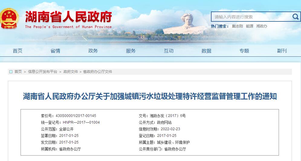 【全文】湖南省人民政府辦公廳關(guān)于加強(qiáng)城鎮(zhèn)污水垃圾處理特許經(jīng)營(yíng)監(jiān)督管理工作的通知