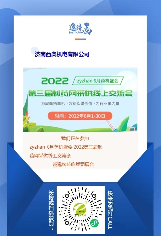 由制藥網(wǎng)主辦的zyzhan 6月藥機(jī)盛會(huì)——2022第三屆制藥網(wǎng)采供線(xiàn)上交流會(huì)(在線(xiàn)展會(huì))(簡(jiǎn)稱(chēng)“zyzhan 6月藥機(jī)盛會(huì)”)即將于2022年6月1日-6月30日舉行。本次盛會(huì)設(shè)原料藥機(jī)械館、制劑機(jī)械館、儀器儀表館、藥品包裝機(jī)館、制藥用水/氣設(shè)備館、通用機(jī)械設(shè)備館、其他制藥設(shè)備館,目前超百家企業(yè)都已入駐相應(yīng)展館,正在等待與您相見(jiàn)!