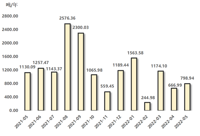 2022年5月,排污權(quán)成交量指標(biāo)環(huán)比、同比走勢(shì)相異,四項(xiàng)排污權(quán)成交量合計(jì)為798.94噸,環(huán)比漲幅為19.78%,與上年同期相比下降29.30%。