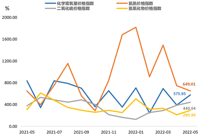 從環(huán)比情況看,指數(shù)呈現(xiàn)“三漲一跌”走勢(shì),化學(xué)需氧量、二氧化硫、氮氧化物環(huán)比分別上漲48.10%、14.16%、38.22%,氨氮環(huán)比下跌12.83%;與上年同期相比,指數(shù)呈現(xiàn)“兩漲兩跌”走勢(shì),氮氧、二氧化硫同比分別上漲0.41%、17.16%,化學(xué)需氧量、氮氧化物同比分別下跌30.93%、4.42%。
