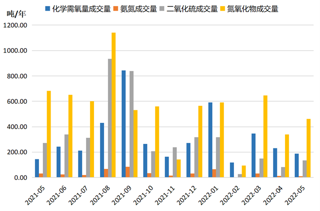 5月點(diǎn)評(píng)簡(jiǎn)報(bào):浙江省排污權(quán)交易指數(shù)低位反彈,環(huán)比、同比走勢(shì)相異。四種主要污染中,NH3-N(氨氮)價(jià)格指數(shù)環(huán)比下跌,COD(化學(xué)需氧量)、SO2(二氧化硫)、NOx(氮氧化物)價(jià)格指數(shù)均呈不同程度上行走勢(shì)。從成交量和交易活躍度來(lái)看,2022年5月,浙江省排污權(quán)交易活躍度微幅走低,成交量則較4月有所增多。