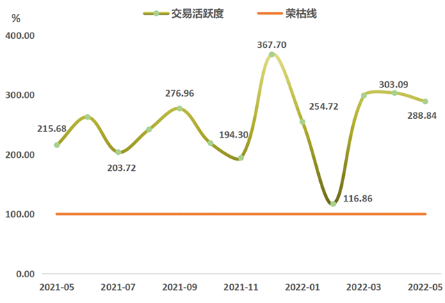 2022年5月,浙江省排污權(quán)交易活躍度指數(shù)為288.84點(diǎn),環(huán)比下行4.70%,與上年同期相比上行33.92%。