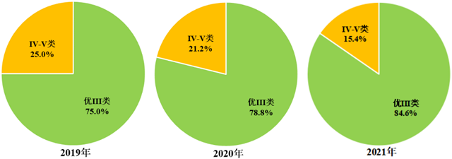 優(yōu)Ⅲ類水質(zhì)斷面比例逐年上升,2021年示范區(qū)優(yōu)Ⅲ類水質(zhì)斷面比例較2020年上升5.8個(gè)百分點(diǎn),較2019年上升9.6個(gè)百分點(diǎn);2021年氨氮和總磷平均濃度較2020年分別下降18.6%和6.3%,較2019年分別下降35.2%和14.4%;2019~2021年高錳酸鹽指數(shù)年均值基本持平。