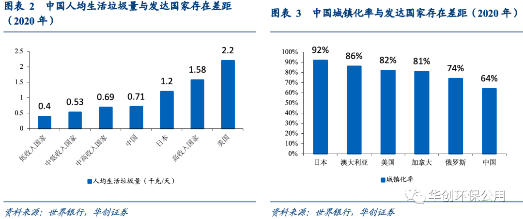 (二)我國(guó)城鎮(zhèn)化率、人均垃圾清運(yùn)量與發(fā)達(dá)國(guó)家存在明顯差距