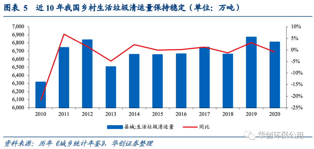 根據(jù)《2020城鄉(xiāng)建設(shè)統(tǒng)計(jì)年鑒》,農(nóng)村地區(qū)現(xiàn)每年產(chǎn)生垃圾總量穩(wěn)定在6600萬(wàn)噸以上,人均垃圾產(chǎn)生量穩(wěn)定處于0.3千克/天的水平。相比城市而言,農(nóng)村的垃圾產(chǎn)生規(guī)模和人均垃圾產(chǎn)生量遠(yuǎn)遠(yuǎn)偏低,雖然存在鄉(xiāng)村人口萎縮的情況,但由于農(nóng)村地區(qū)垃圾收集、處置率存在較大的提高空間,依靠對(duì)未處理的垃圾存量的消化和擴(kuò)大處理覆蓋,未來(lái)農(nóng)村垃圾處理規(guī)模的擴(kuò)張可期。