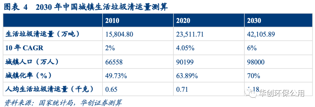 中國(guó)未來(lái)城市生活垃圾產(chǎn)生量仍存在較大上升空間。根據(jù)中國(guó)社會(huì)科學(xué)院農(nóng)村發(fā)展研究所、中國(guó)社會(huì)科學(xué)出版社聯(lián)合發(fā)布《城市藍(lán)皮書(shū):中國(guó)城市發(fā)展報(bào)告No.12》,預(yù)計(jì)到2030年,中國(guó)城鎮(zhèn)化率將達(dá)到70%。按照2030年城鎮(zhèn)化率達(dá)到70%、城鎮(zhèn)人均1.18千克/天的垃圾產(chǎn)生量計(jì)算,中國(guó)的城鎮(zhèn)垃圾量將達(dá)到4.21億噸/年。若按未來(lái)城鎮(zhèn)化率達(dá)到80%、城鎮(zhèn)人均1.18千克/天的垃圾產(chǎn)生量計(jì)算,未來(lái)中國(guó)城鎮(zhèn)垃圾量將達(dá)到4.91億噸/年。