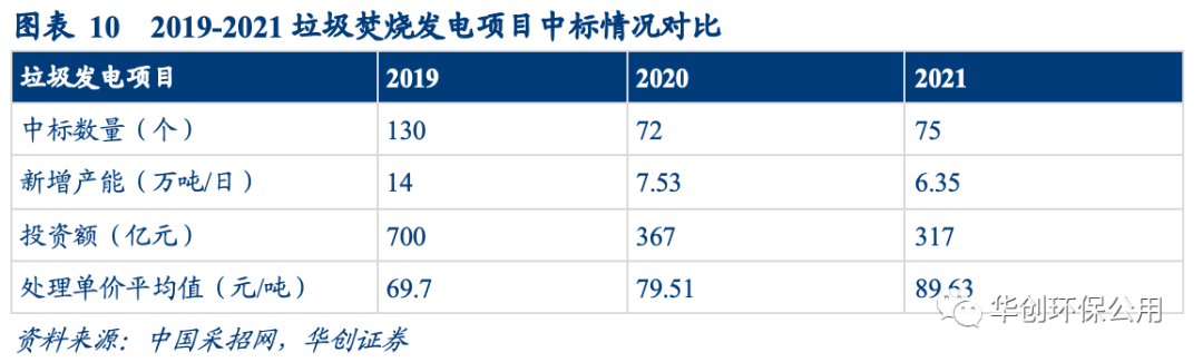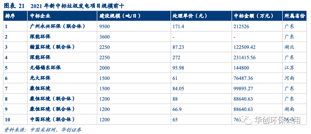 垃圾焚燒新訂單釋放速度減緩、處理費(fèi)價(jià)格提升。2021年垃圾焚燒新增體量進(jìn)一步下降,全年中標(biāo)項(xiàng)目總處理規(guī)模達(dá)6.35萬(wàn)噸/日,同比2020年下降15.67%。與此同時(shí),2021年平均中標(biāo)處理單價(jià)為89.63元/噸,同比2020 年增長(zhǎng)12.73%。近三年以來(lái)中標(biāo)價(jià)一直維持快速上升態(tài)勢(shì),疊加政策推動(dòng),我們認(rèn)為未來(lái)很可能按照“產(chǎn)生者付費(fèi)”原則,實(shí)施居民處理費(fèi),健全收費(fèi)機(jī)制,垃圾處理費(fèi)單價(jià)有望進(jìn)一步提升,降低對(duì)補(bǔ)貼依賴(lài)程度。