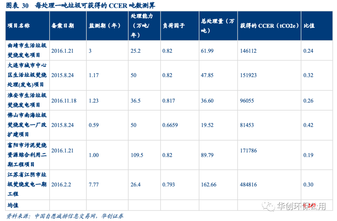我們采用垃圾處理量與所獲得CCER噸數(shù)之比作為統(tǒng)計(jì)口徑,從簽發(fā)和備案項(xiàng)目中選取了較為典型的垃圾焚燒項(xiàng)目計(jì)算平均值,根據(jù)測(cè)算垃圾焚燒企業(yè)每處理一噸垃圾,平均獲得0.287噸CCER,在假設(shè)CCER價(jià)格為20元/噸的情況下,噸垃圾增收約為6元。