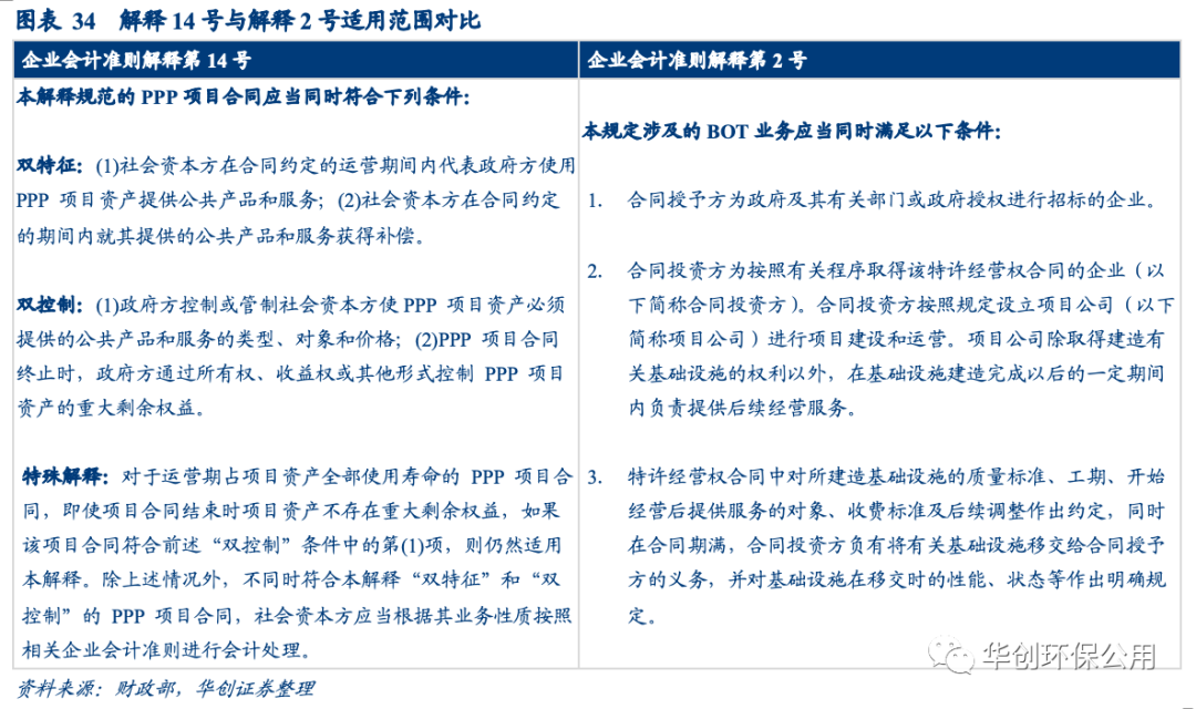 解釋14號(hào)對(duì)適用范圍做出了更詳細(xì)的說(shuō)明,應(yīng)當(dāng)符合“雙控制”與“雙特征”。解釋2號(hào)僅對(duì)“合同授予方”、“合同投資方”、“特許經(jīng)營(yíng)權(quán)”等關(guān)鍵名詞做出解釋而解釋14號(hào)則對(duì)適用范圍做出明確說(shuō)明——滿(mǎn)足“雙控制”與“雙特征”條件,并對(duì)運(yùn)營(yíng)期占項(xiàng)目資產(chǎn)全部使用壽命項(xiàng)目、不符合“雙控制”與“雙特征”條件項(xiàng)目的處理方法做出解釋。