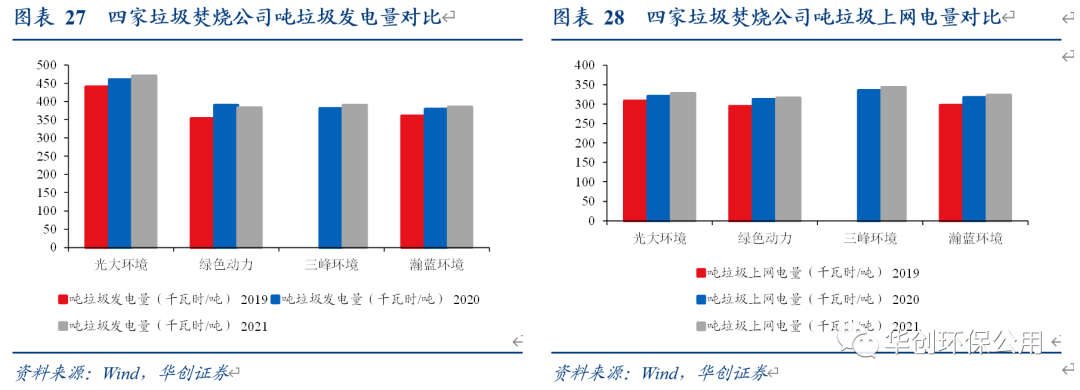 我們選取光大環(huán)境、三峰環(huán)境、瀚藍(lán)環(huán)境和綠色動(dòng)力四家上市公司進(jìn)行比較,所有公司的2019-2021年的噸垃圾發(fā)電量與噸垃圾上網(wǎng)電量均呈現(xiàn)上升趨勢(shì)。2021年光大環(huán)境的噸垃圾發(fā)電量已達(dá)到470度,大幅領(lǐng)先其余公司;噸上網(wǎng)電量四家公司差距不大,均在320-340度這一區(qū)間。我們認(rèn)為噸垃圾發(fā)電量的逐年提升亦可以增厚垃圾焚燒項(xiàng)目的盈利能力,削弱國(guó)補(bǔ)退坡的不利影響。