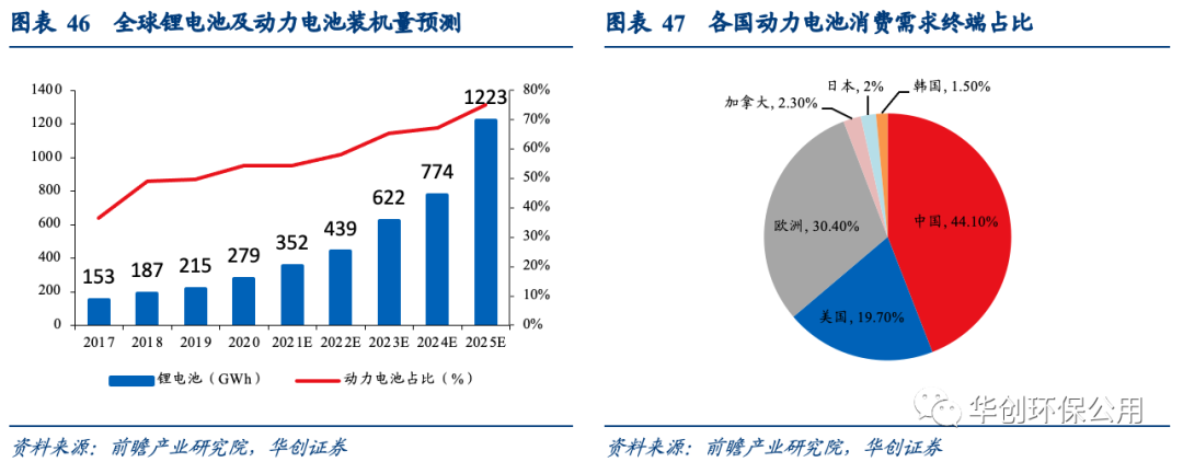 在電動(dòng)汽車(chē)市場(chǎng)快速增長(zhǎng)帶動(dòng)下,動(dòng)力型鋰離子電池繼續(xù)保持快速增長(zhǎng)勢(shì)頭。全球動(dòng)力電池年新增裝機(jī)量保持快速增長(zhǎng),根據(jù)前瞻產(chǎn)業(yè)研究院的預(yù)測(cè),2025年全球鋰電池裝機(jī)量將會(huì)達(dá)到1223GWh,動(dòng)力電池占比高達(dá)75.2%。2020年中國(guó)動(dòng)力電池終端消費(fèi)需求高達(dá)44.1%,居世界第一位。硫酸鈷和硫酸鎳是生產(chǎn)三元?jiǎng)恿﹄姵氐闹匾牧?,未?lái)有望量?jī)r(jià)齊升。