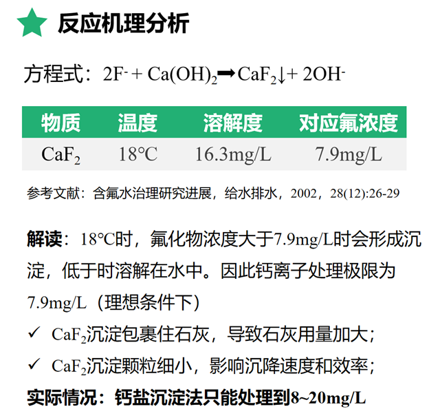 傳統(tǒng)的鈣鹽(石灰)沉淀法除氟在機(jī)理上不能滿足當(dāng)下的要求(如下圖),其最多只能將氟化物處理到8~20mg/L。污水廠的嚴(yán)格排放,倒逼企業(yè)深度治理,迫在眉睫。