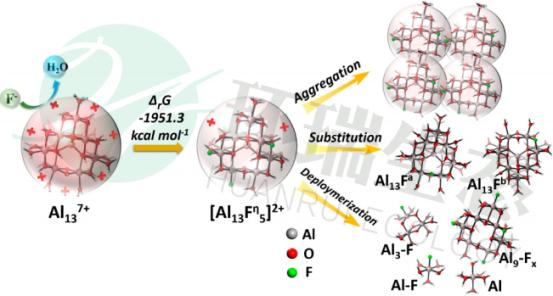 其中“氟凈”系列除氟劑,除氟功能單元含量比市面同類型產(chǎn)品高出20-50%,且主要為經(jīng)特殊設(shè)計(jì)的Al13結(jié)構(gòu)。其主要微觀機(jī)理如下所示,Al13結(jié)構(gòu)使得大量的氟離子能夠與OH-實(shí)現(xiàn)交換,去除同樣量的氟化物,用量更少。