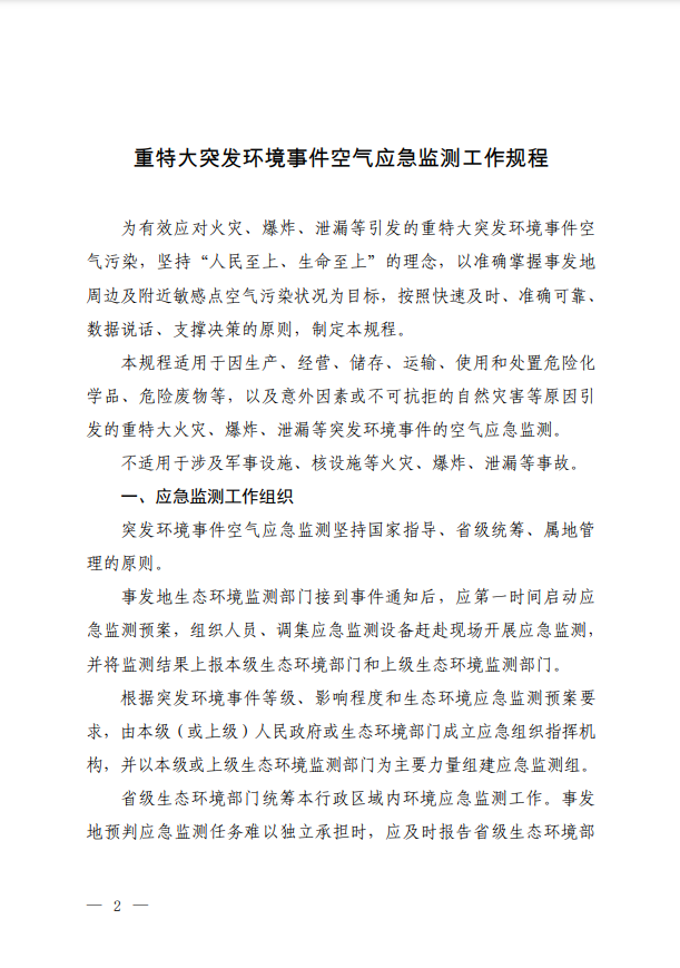 2022年6月15日,生態(tài)環(huán)境部印發(fā)《重特大突發(fā)環(huán)境事件空氣應(yīng)急監(jiān)測(cè)工作規(guī)程》,本規(guī)程適用于因生產(chǎn)、經(jīng)營(yíng)、儲(chǔ)存、運(yùn)輸、使用和處置危險(xiǎn)化學(xué)品、危險(xiǎn)廢物等,以及意外因素或不可抗拒的自然災(zāi)害等原因引發(fā)的重特大火災(zāi)、爆炸、泄漏等突發(fā)環(huán)境事件的空氣應(yīng)急監(jiān)測(cè)。