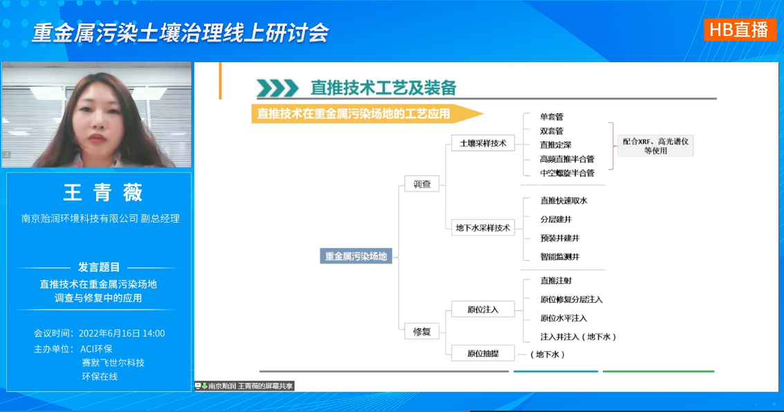 南京貽潤環(huán)境科技有限公司副總經(jīng)理王青薇介紹了直推技術(shù)在重金屬污染場地調(diào)查與修復中的應(yīng)用。王總介紹,直推技術(shù)是指通過直推式鉆機將內(nèi)附采樣器、傳感器的鉆桿通過推進、沖擊或振動的方式貫入地層,以快速采集代表性的土壤、土壤氣體和地下水樣品,或通過所裝備的檢測儀器獲取相關(guān)數(shù)據(jù)的技術(shù)總稱。王總介紹了南京貽潤的EP1000系列便攜式、履帶式直推鉆機、EP2000系列履帶式直推鉆機、EP4000C履帶式直推鉆機以及EP3080工作站,及其在土壤調(diào)查采樣中應(yīng)用。