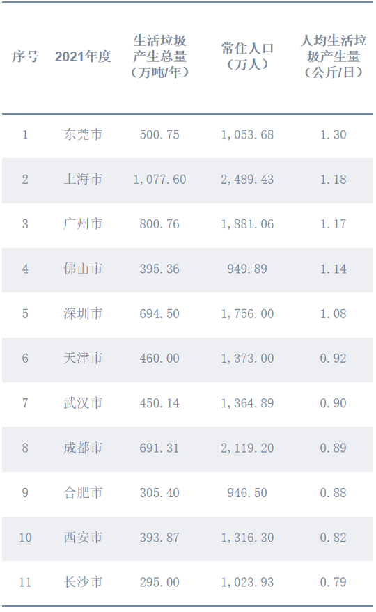 2021年度,11個重點城市中,人均生活垃圾產(chǎn)生量最高的城市是東莞市,人均每日產(chǎn)生生活垃圾1.30公斤;人均生活垃圾產(chǎn)生量最低的城市是長沙市,人均每日產(chǎn)生生活垃圾0.79公斤。