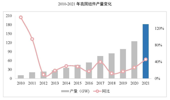 盡管受到供應(yīng)鏈價格波動、外部環(huán)境復(fù)雜嚴峻和不確定性增多等不利因素影響,2021年我國光伏制造端規(guī)模仍保持迅速擴大態(tài)勢。2021年,我國多晶硅產(chǎn)量達50.6萬噸,同比增長27.8%,硅片產(chǎn)量約為226.6GW,同比增長40.4%。電池片產(chǎn)量為197.9GW,同比增長46.8%,增幅最大。組件產(chǎn)量為181.8GW,同比增長45.9%。