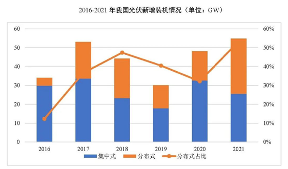 2021年,我國光伏新增裝機量、分布式裝機量、戶用裝機量以及分布式裝機在總裝機量中的占比均創(chuàng)歷史新高。我國光伏新增裝機54.88GW,同比增長13.9%,其中,分布式裝機約29.28GW,占全部新增裝機的53.4%,歷史上首次突破50%。2021年戶用裝機達21.6GW,同比增長113.3%,占2021年我國新增光伏裝機的39.4%。光伏發(fā)電量3259億千瓦時,同比增長25.1%,全國利用小時數(shù)1163小時,同比增加3小時,光伏發(fā)電利用率98%,與上年基本持平,新疆、西藏等地光伏消納水平顯著提升,光伏利用率同比分別提升2.8%和5.6%。