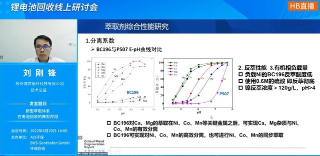 最后,在電池回收濕法工藝弊端凸顯的背景下,新型萃取體系值得期待嗎?這就要聽(tīng)劉剛鋒技術(shù)總監(jiān)怎么說(shuō)啦。“使用BC196處理正極溶液得到鎳鈷錳電池級(jí)前體相較于傳統(tǒng)流程每噸可節(jié)省10-20%的成本”,從萃取劑綜合性能研究,到鎳鎂分離、鎳鋰分離,再到與現(xiàn)有流程的對(duì)比,一應(yīng)俱全。