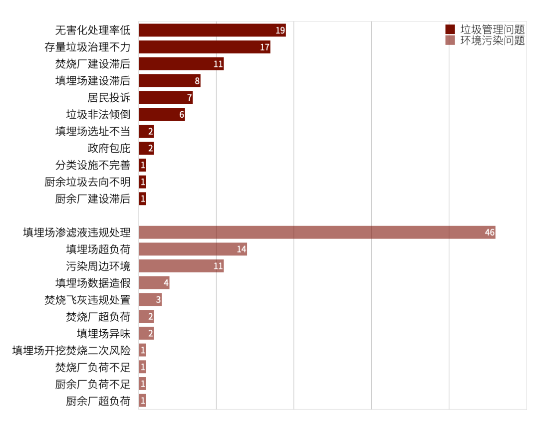 在垃圾管理問題中,無害化處理率低、存量垃圾治理不力、焚燒廠建設(shè)滯后、填埋場建設(shè)滯后等問題表現(xiàn)突出。