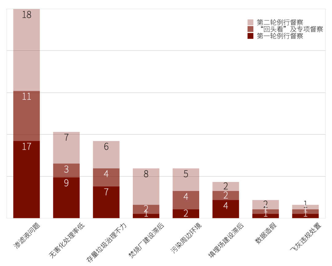 中央環(huán)保督察作為中國生態(tài)文明建設(shè)的一項(xiàng)重大制度創(chuàng)新,是落實(shí)環(huán)境保護(hù)“黨政同責(zé)”“一崗雙責(zé)”主體責(zé)任的重要舉措,具有代表中央權(quán)威、剛性約束、公眾參與、持續(xù)追蹤等特征。2015年開始至2022年6月,中央環(huán)保督察組共完成了2輪針對31個(gè)省區(qū)市的例行督察和1輪針對20個(gè)省區(qū)市的“回頭看”及專項(xiàng)督察,其中“生活垃圾”作為與公眾生活息息相關(guān)的議題,在中央環(huán)保督察工作組向各省區(qū)市反饋督察情況時(shí)頻繁出現(xiàn),個(gè)別嚴(yán)重問題因整改不力被公眾反復(fù)舉報(bào)。統(tǒng)計(jì)發(fā)現(xiàn),82份反饋意見中有60份涉及生活垃圾問題,分類統(tǒng)計(jì)歸納為兩大類22個(gè)小項(xiàng)共包含161次生活垃圾問題(部分省份的單份反饋意見中同時(shí)包括多個(gè)不同的生活垃圾問題),其中滲濾液違規(guī)處理問題最為突出、飛灰違規(guī)處置等問題反復(fù)出現(xiàn)、焚燒廠建設(shè)滯后等階段性出現(xiàn)。中央環(huán)保督察源自2015年7月中央全面深化改革領(lǐng)導(dǎo)小組第十四次會(huì)議,會(huì)議審議通過《環(huán)境保護(hù)督察方案(試行)》,也標(biāo)志著中央生態(tài)環(huán)境保護(hù)督察制度(原中央環(huán)境保護(hù)督察,一般稱中央環(huán)保督察)正式建立。